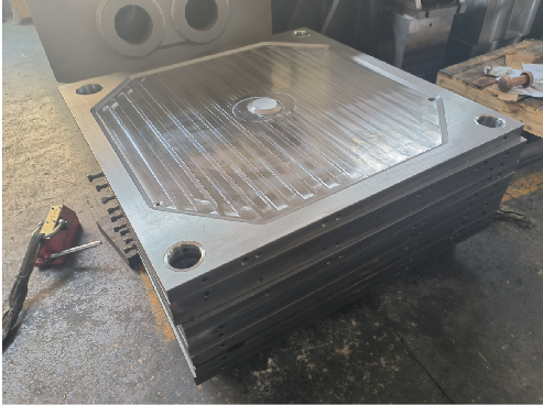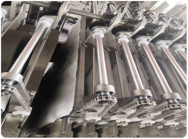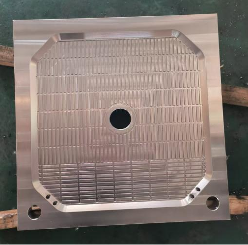 如圖所示,熱壓千化原理是基于潮濕木材一端燃燒受熱,另一端有液體滲出的自然現(xiàn)象,將機械分離形成的濾餅類物料置于密閉熱壓干化室內(nèi)(如圖2),室內(nèi)上部干燥板內(nèi)蛇形迷宮孔道通入流體熱介質(zhì)(如飽和蒸汽或?qū)嵊?將干燥板加熱,靠近干燥板的物料毛細管水分受熱汽化膨脹,驅(qū)使下端毛細管液體以液相非汽化方式向下涌出物料表面。此外,控制熱壓千化室真空負壓,降低物料所含液體的汽化溫度熱壓千化機是實現(xiàn)熱壓千化固液分離技術(shù)的核心設備。將一對干燥板和熱壓濾板設計成一個工作模塊,干燥板為內(nèi)設迷宮流體熱介質(zhì)孔道的防腐金屬過濾板,熱壓濾板是采用德國標準(DIN7129-1980zh)制造的耐熱隔膜濾板,每臺設備可根據(jù)生產(chǎn)能力匹配若千熱壓千化模塊置于機架之上,實現(xiàn)熱壓干化固液分離效能。